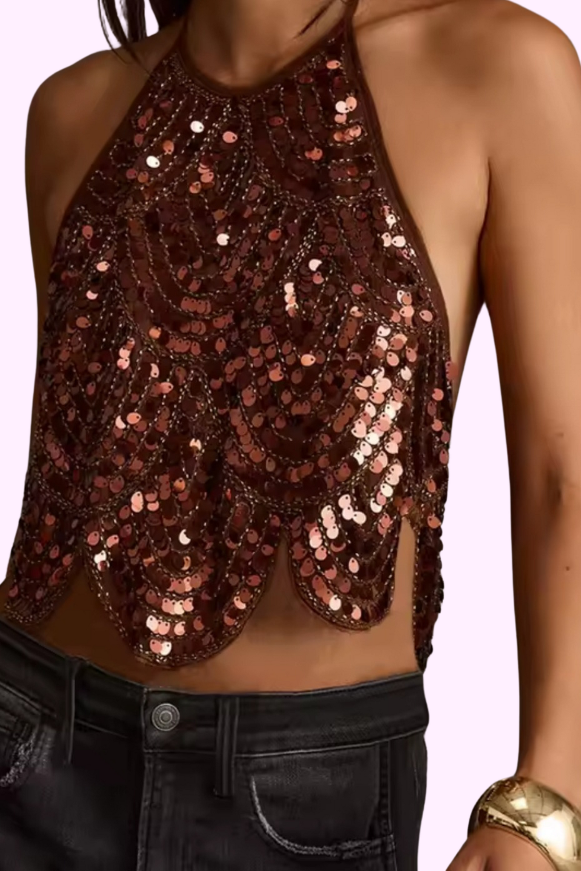 Get ready to sparkle and shine in our Expensive Taste Top! This halter top is covered with sparkly sequins and features a scalloped edge for a touch of elegance. It's the perfect choice for a glam night out. Time to show off your expensive taste (without breaking the bank).