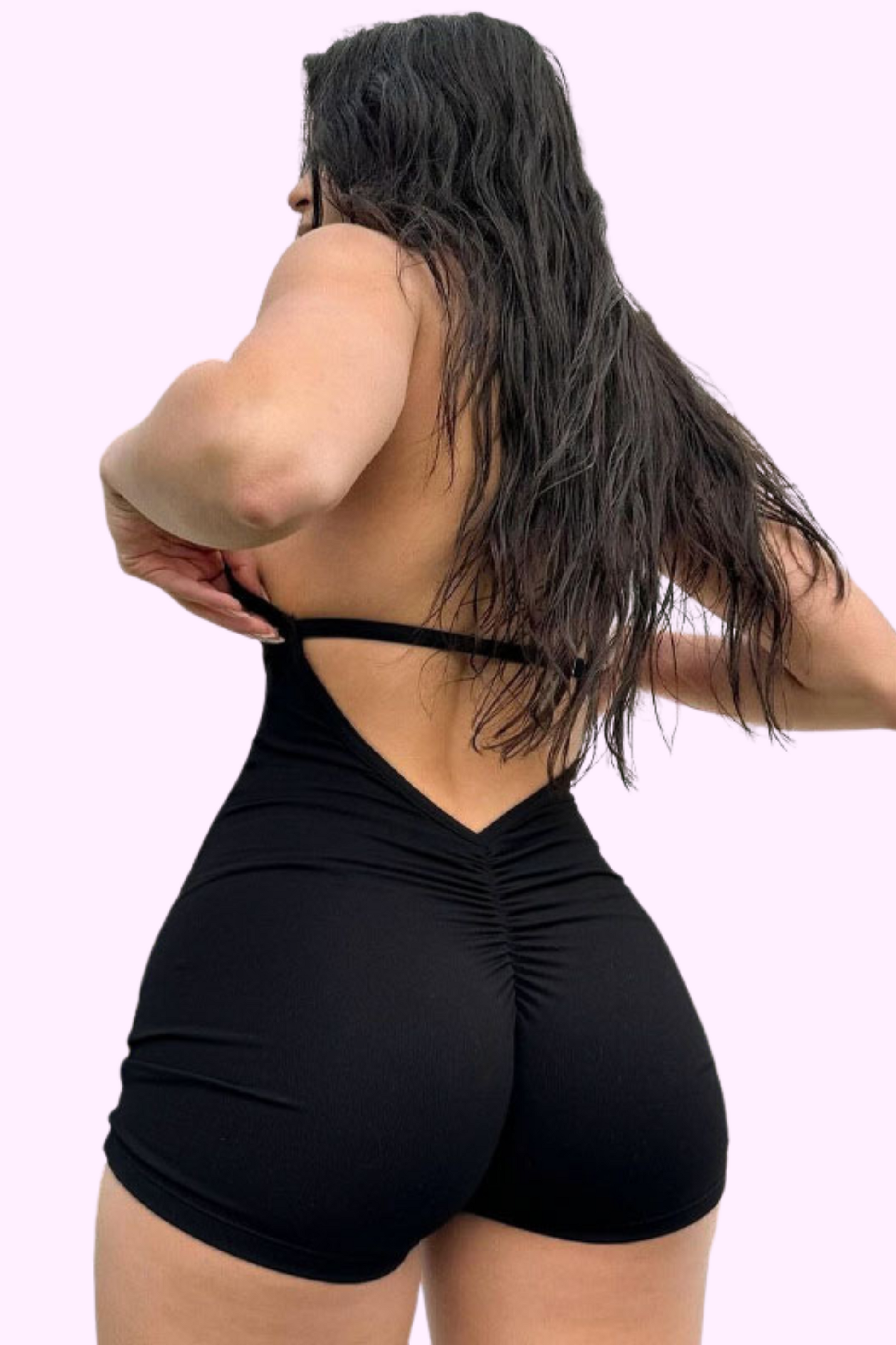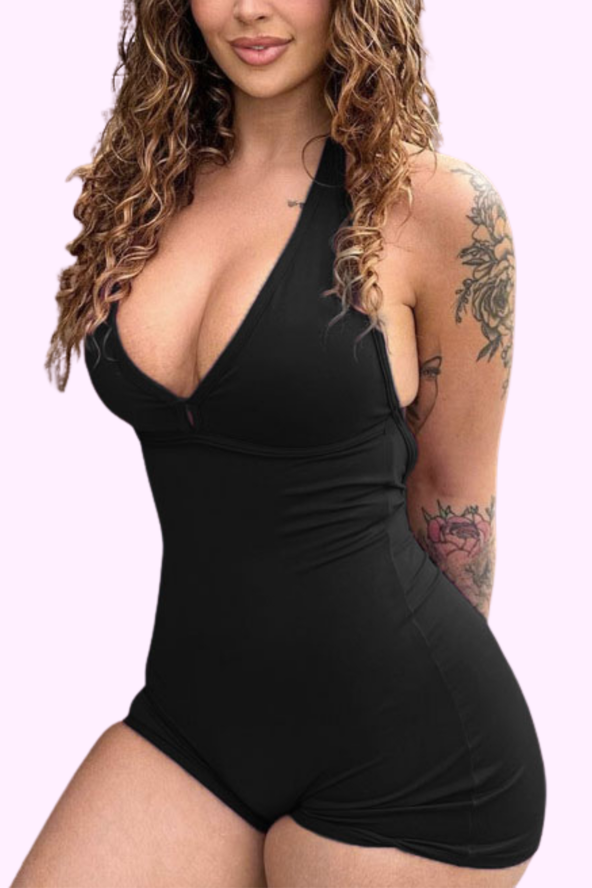 Bring the heat with our Spicy Secrets Romper! Featuring a strappy back and ruched detailing, this romper will have you feeling confident and stylish. Show off your playful side with this fun and flirty piece.